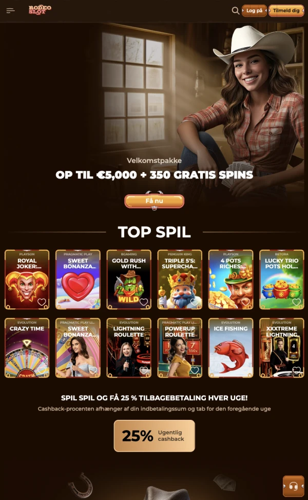 Hvis du vælger et casinotilbud, inkluderer dine RodeoSlot bonus-muligheder i Danmark en match på første indbetaling på 100% op til 3.750 DKK / 500 EUR plus 150 Free Spins, med en minimumsindbetaling på 112 DKK / 15 EUR og et omsætningskrav på 40x på bonusbeløbet. Vi kører også ugentlig cashback på op til 25% af nettotab, som krediteres hver mandag, og der kan være Free Spins via henvisningskoder til nye medlemmer.